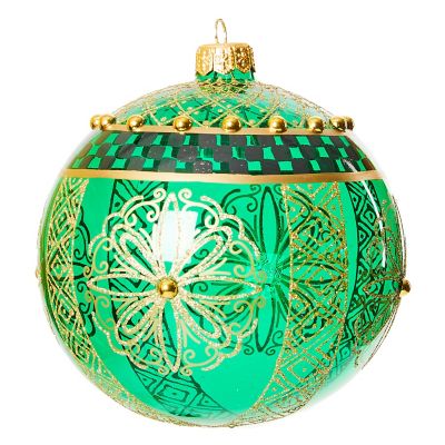 Add to the memories year after year with our collection of beautiful glass ornaments that are mouth-blown and hand-painted in Eastern Europe by some of the world’s most talented glass artisans. This clear emerald green glass ornament is accented with golden florals and stripes and trimmed with golden accents. It’s presented in a keepsake gift/storage box.