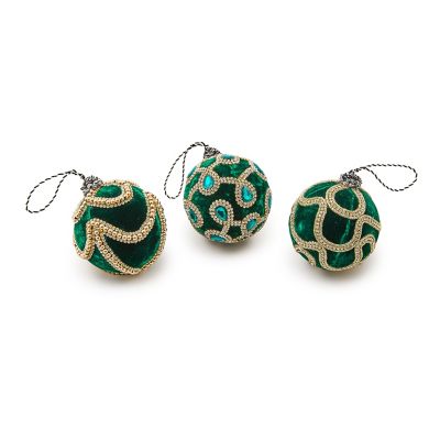 Make the tree magnificent with this set of three ball ornaments. Each has a distinct rhinestone pattern on emerald green velvet and hangs from a twisted black and white cord.