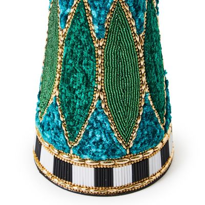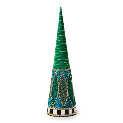 Deck the tabletops with this small cone-shaped tree that’s embellished with velvet ribbon and patterns done in emerald green and blue chenille and beads. It’s finished with bands of faceted black and white accents.