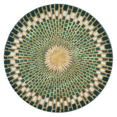 Our 3′ Round Emerald Sunburst Rug mixes greens and golds in a classic mosaic pattern. This wool-blend tufted and hooked rug is the perfect complement to our Emerald collection of furniture.