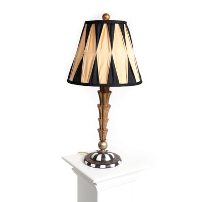 Add an enlightening touch with our Evenfall Table Lamp, decorated with stacked metal tiers atop a base accented with stripes, harlequin diamonds, and gold leaf. The accompanying harlequin pleat shade is done in gold and black.