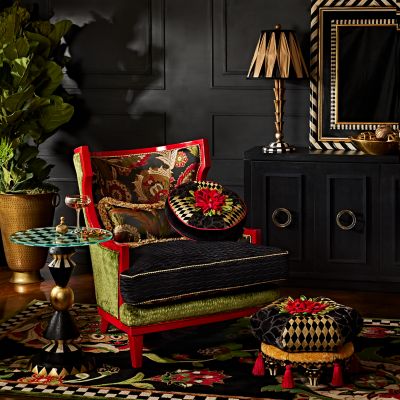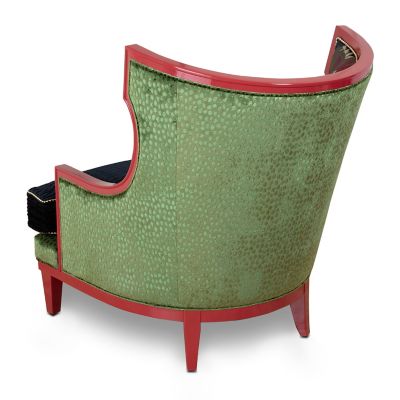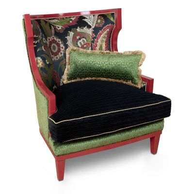 Sit back and relax in the sleek silhouette of the Evenfall Wing Chair. Crafted of red high- sheen beechwood, it’s upholstered in a luxurious Pierre Frey floral brocade, accented with Lurex threads, and finished with stitched harlequin trim. As versatile as it is vibrant, the loose seat cushion reverses from brocade to black pleated waves. An additional down toss pillow that flips from brocade to a woven green pattern is trimmed with fringe.