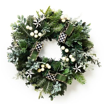 Deck all the small spaces, from the cabinet doors in your kitchen to the backs of chairs, with this mini wreath made of everlasting evergreens and decorated with black and white dimensional stars. It’s finished with our green faux suede and Courtly Check® ribbon.