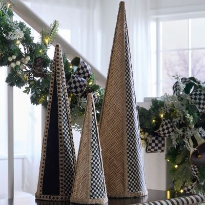 Deck the tabletops or the mantel with this set of three cone-shaped trees, decorated with a mix of Courtly Check® fabric, rattan, and faux suede, and finished with woven jute trim.