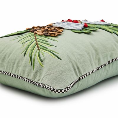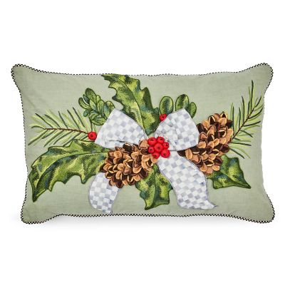 Add comfort and joy to your holiday home with this lumbar pillow, featuring appliqued and embroidered holly leaves, accented with dimensional pinecones and holly berries, and trimmed with a Sterling Check® ribbon bow.