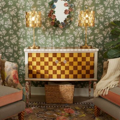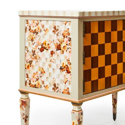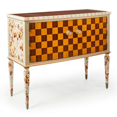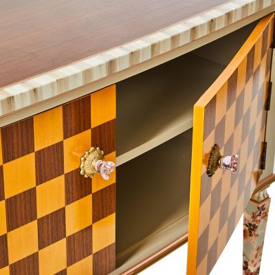 This console table makes a dramatic statement. It features stained maple veneer on top and maple and walnut marquetry on the doors, which are accented with pink flower-shaped glass knobs. Our Aurora artisans add hand-painted Mocha Check and Stripe, plus floral paper on the sides and legs. Inside, there is one adjustable shelf.