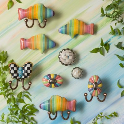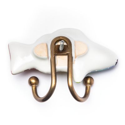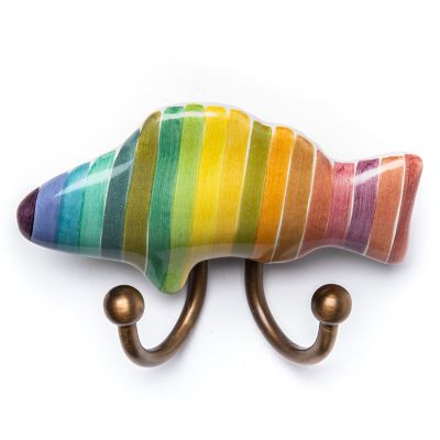 Our Rainbow Fish Hook Left takes you under the sea without ever leaving the shore. This ceramic left-facing fish silhouette features a kaleidoscope of color. Two handy hooks, done in a brass finish, provide the perfect place to hang oven mitts in the kitchen, bathrobes in the powder room or keys in the foyer.