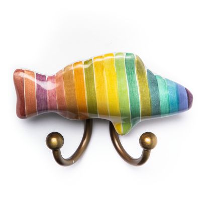 Our Rainbow Fish Hook Right takes you under the sea without ever leaving the shore. This ceramic right-facing fish silhouette features a kaleidoscope of color. Two handy hooks, done in a brass finish, provide the perfect place to hang oven mitts in the kitchen, bathrobes in the powder room or keys in the foyer.
