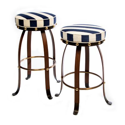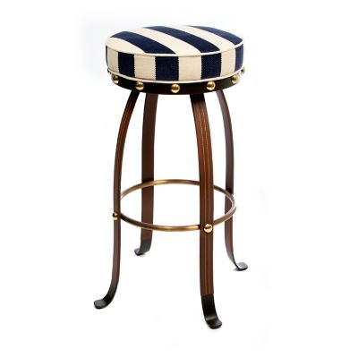 Please be seated in The Entertaining Kitchen on the Navy Flatiron Bar Stool. With stylishly shaped metal legs wrapped in leather and trimmed with brass button detailing, it’s fitted with a comfortable cushion upholstered in chenille navy stripe. Talk about the best seat in the house!