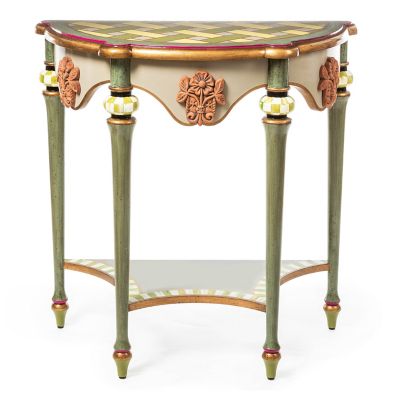 Turn the tables on the ordinary console table with this piece, featuring a hand-applied, antiqued green-gold finish. The top is decorated with a hand-painted lattice pattern and the bottom shelf has a chartreuse stripe around the border. Our Aurora, New York, artisans have added majolica floral ornamentation on the apron that’s inspired by the garden edge tile on our Upstate property.