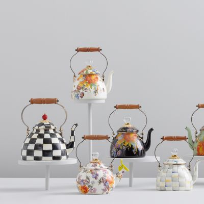 Bubbling over with MacKenzie-Childs style, our Black Flower Market 2 Quart Tea Kettle will have you finding new reasons to put the kettle on to boil. The heavy-gauge steel underbody is glazed with lush garden hues, hand decorated with fanciful botanical decals, and rimmed in bronzed stainless steel. Wood handle and glass-topped lid. Gorgeous filled with fresh-cut flowers or greens, too.
