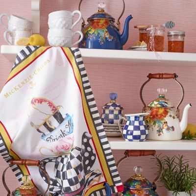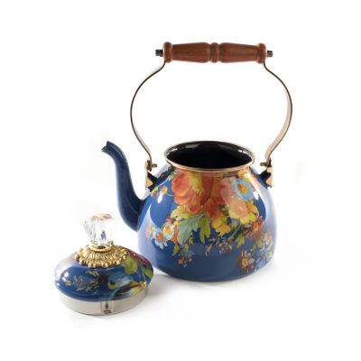 Bubbling over with MacKenzie-Childs style, our Lapis Flower Market 2 Quart Tea Kettle will have you finding new reasons to put the kettle on to boil. The heavy-gauge steel underbody is glazed with a deep blue, hand decorated with fanciful botanical transfers, and rimmed in bronzed stainless steel. It also features a wood handle and a lid topped with a clear glass knob. Gorgeous filled with fresh-cut flowers or greens, too.