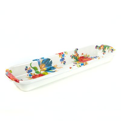The Flower Market Baguette Dish really does it all. Of course, as its name implies, it’s charming holding a fragrant baguette on the dining table. But its ample, elongated shape can serve all types of food. It even goes out of the kitchen and could hold pencils in a home office or washcloths in a bathroom. Heavy-gauge, hand-glazed steel underbody with hand-applied floral transfers.