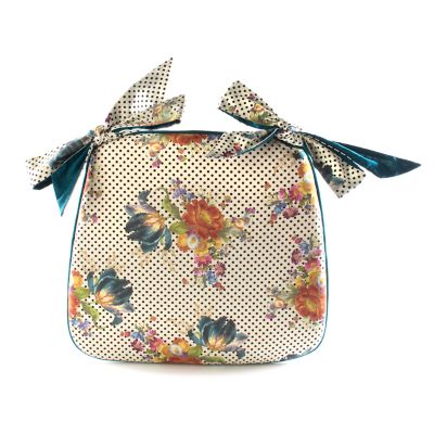 Turn every dining chair into the best seat in the house with our Flower Market Chair Cushion. Featuring a perfectly balanced combination of comfort and style, this posh pad is a print of our Flower Market dinnerware patterns on a background of black polka dots and fitted with matching ties. Courtly Stripe fabric is on the reverse side.