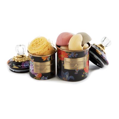 Add to the endless possibilities for our canisters with the enamel Demi Black Flower Market Canister. A step up from our smallest sized canister, the Demi stands handsomely alone or harmonizes delightfully in a set. Keep it in the kitchen or invent new uses around the house. It’s perfect for cotton balls and swabs in the bathroom, pens and pencils in the office, or knickknacks and doodads in the kids’ room. Color glazed in black, it’s decorated with hand-applied fanciful botanical transfers that recall a lush English garden in the peak of summer, and the lid is topped with a clear glass knob.