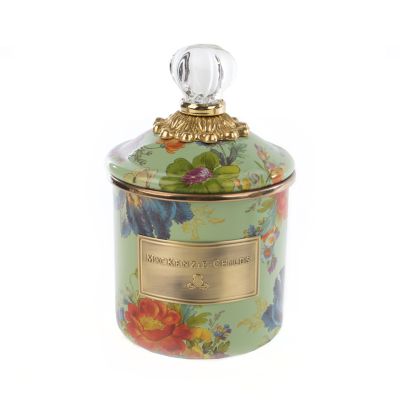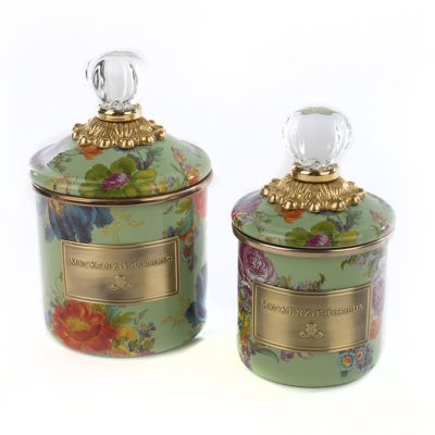 Add to the endless possibilities for our canisters with the enamel Demi Green Flower Market Canister. A step up from our smallest sized canister, the Demi stands handsomely alone or harmonizes delightfully in a set. Keep it in the kitchen or invent new uses around the house. It’s perfect for cotton balls and swabs in the bathroom, pens and pencils in the office, or knickknacks and doodads in the kids’ room. Color glazed in green, it’s decorated with hand-applied fanciful botanical transfers that recall a lush English garden in the peak of summer, and the lid is topped with a clear glass knob.