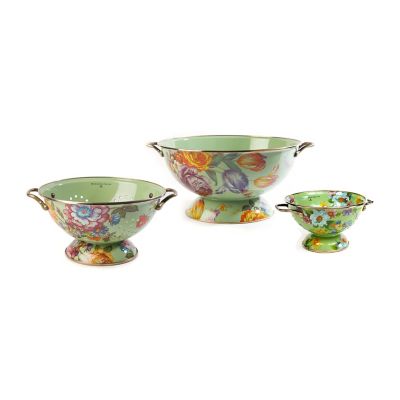 Ready for the Kitchen! The Flower Market Green Enamel Everything Bowl, Flower Market Green Enamel Small Colander and Flower Market Green Enamel Small Colander can handle kitchen preparations with ease. Color-glazed in black, green or white, each enamel colander is decorated with hand-applied fanciful botanical transfer decorations that recall a lush English garden in the peak of summer.