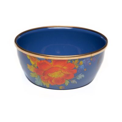Our Lapis Flower Market Pinch Bowl makes prep work a stylish snap. With its just-right size and fresh, floral pattern, this petite pot is equally charming when brimming with paper clips in a home office or lemon wedges on a wet bar. Heavy-gauge, hand-glazed steel underbody in rich blue with hand-applied floral transfer decoration and a bronzed stainless-steel rim.