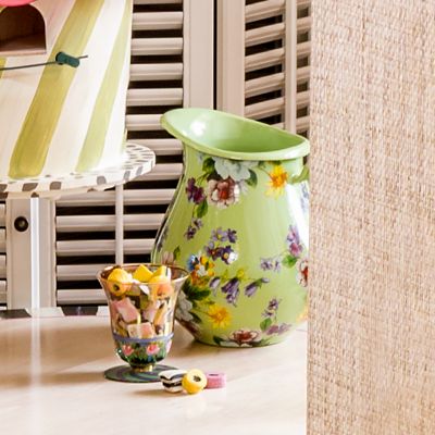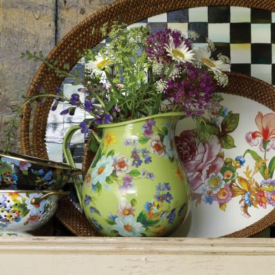 For ice water, fresh-squeezed lemonade or a refreshing punch, our bright and cheerful Green Flower Market Pitcher dresses up the bar or dinner table. Makes a great gift paired with a basket of fresh fruit and a bottle of red wine for a stylish sangria, or fill with late-August sunflowers to add a cheerful warmth to your kitchen. Heavy-gauge, hand-glazed steel underbody with hand-applied fanciful botanical transfers that recall a lush English garden.
