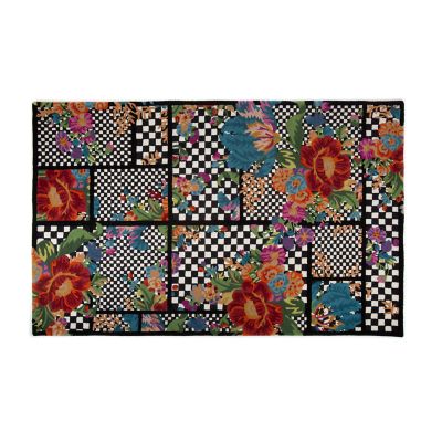 The 5′ × 8′ Black Flower Market Trellis Rug features one of our classic dinnerware patterns, bringing its color and charm to your floors. This wool-blend, hand-tufted rug features Black Flower Market panels, separated by stripes, on Courtly Check® backgrounds. More interest comes from the weaving technique, where the blossoms are sculpted slightly higher, adding a bit of dimension.