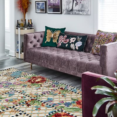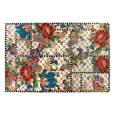 The 5′ x 8′ Flower Market Trellis Rug features one of our classic dinnerware patterns, bringing its color and charm to your floors. This wool-blend, hand-tufted rug features the look of a collage of Flower Market panels, separated by stripes, on a lattice background. More interest comes from the blossoms being sculpted slightly higher, adding a bit of dimension.