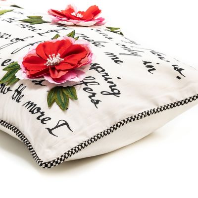 You’d be hard pressed to find a pillow more romantic than the Flower Show Poetry Pillow. Decorated with the poetry of Emily Dickinson and embellished with dimensional flowers and appliqued and embroidered leaves, this pillow is truly swoon-worthy. The finishing touch is black and white check piping.