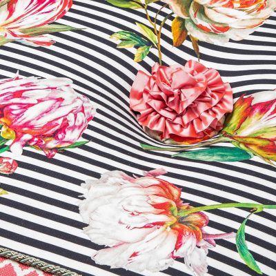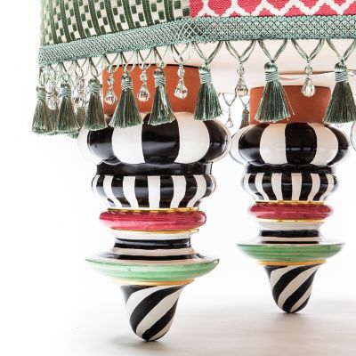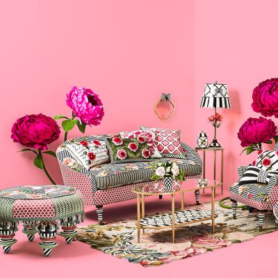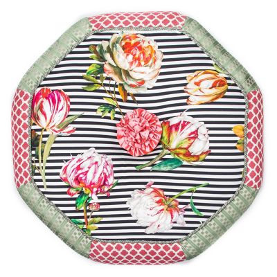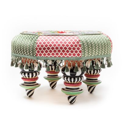 Made start to finish in Aurora, New York, the generously sized Flower Show Setting Seat is in full bloom. It’s upholstered in an exuberant striped and floral pattern that’s accented with printed panels of pink and green, trimmed with twisted cording. Embellished in the center with a lush silk rose, it’s finished with tassel and glass bead fringe, and rests atop four hand-painted ceramic feet.
