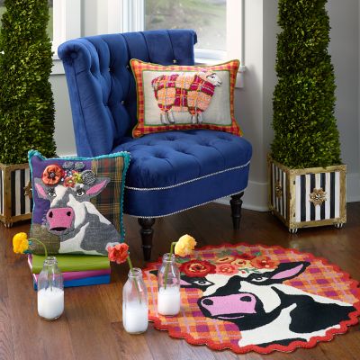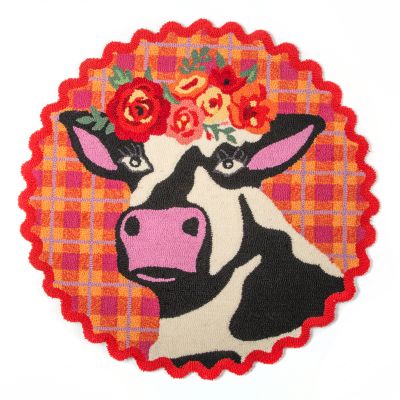 Set the scene for whimsy. The hooked 100% polyester 3′ Round Frida Cowlo Rug makes a welcoming statement featuring our iconic beautiful bovine and her crown of flowers on a background of colorful plaid that’s trimmed with a zigzag edge.