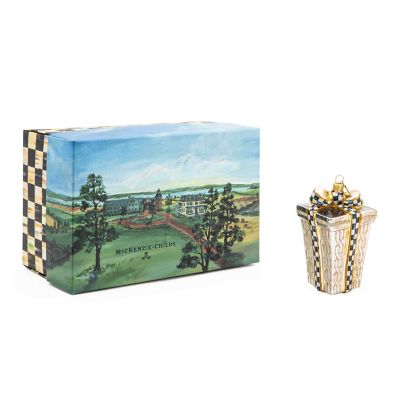 Add to the memories year after year with our collection of beautiful glass ornaments, including this giftwrapped present, decorated with a Courtly Check® bow. This ornament is mouth-blown and hand-painted in Eastern Europe by some of the world’s most talented glass artisans and is presented in a keepsake gift/storage box.