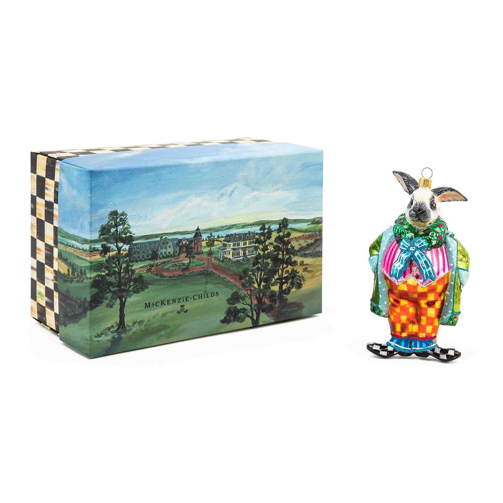 Add to the memories year after year with our collection of beautiful glass ornaments, including this nattily attired rabbit, decorated with touches of Courtly Check®. This ornament is mouth-blown and hand-painted in Eastern Europe by some of the world’s most talented glass artisans and is presented in a keepsake gift/storage box.
