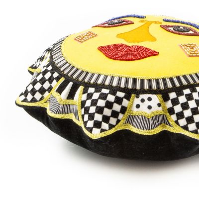 Here comes the Good Day Sunshine Pillow! The sculpted shape of this printed pillow is embellished with embroidery, beads, outlined in an array of black and white patterns and bordered with chartreuse.