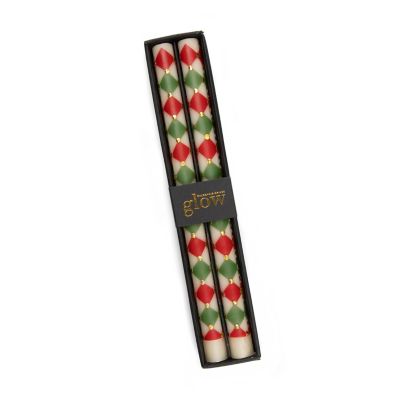 The flicker of candlelight dances beautifully atop our Red, Green, & Gold Harlequin Dot Dinner Candles. A blend of beeswax and paraffin, this set of two candles is embellished with appliques of wax arranged in a pattern of harlequin dots.