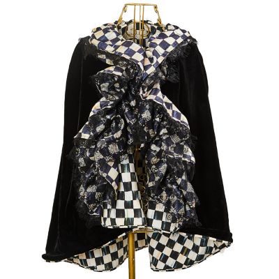 Cast a spell of MacKenzie-Childs style in the Haunted House Courtly Check® Cape. Made of black velvet and lined with Courtly Check, it’s topped with black lace and embellished with a lavish Courtly Check ruffle. Pair it with the matching witch hat and be truly bewitching.