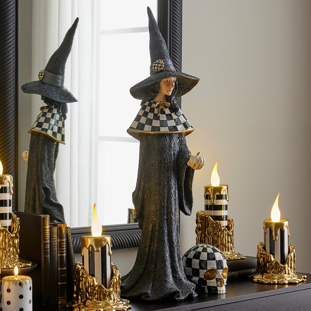 Cast a spell with this witch figurine that wears a gown of faux lace with accents of Courtly Check® on her capelet and hat. Be sure to put this special piece in a spot where it will get lots of attention.