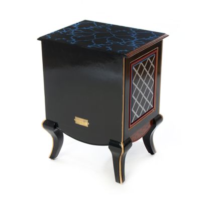 Our Helix Accent Cabinet will bathe you in blue bliss. Made of mango wood, it has a mix of patterns that include hand-painted damask on top with faux tortoiseshell edges and lattice on the sides. The door, which opens to offer storage inside, is accented with a stunning floral blossom crowned with a hand-painted blue tartan bead.