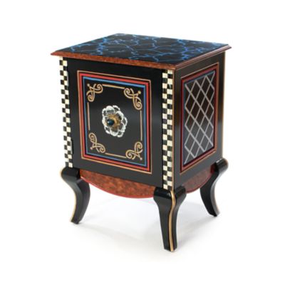 Our Helix Accent Cabinet will bathe you in blue bliss. Made of mango wood, it has a mix of patterns that include hand-painted damask on top with faux tortoiseshell edges and lattice on the sides. The door, which opens to offer storage inside, is accented with a stunning floral blossom crowned with a hand-painted blue tartan bead.