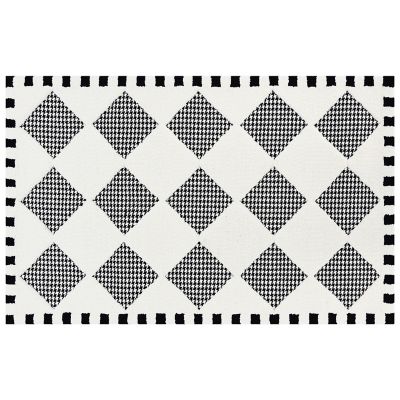 This 3′ x 5′ rug features a pattern of woven jacquard houndstooth diamonds on a field of tufted ivory wool with a black and ivory border.