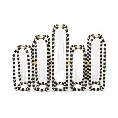 Present flowers or store pens and pencils in our unique set of five Interlocking Bud Vases. The metal frame, which is decorated with black and white beads, holds individual glass vase vials. Display them together or separately.