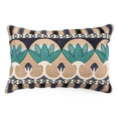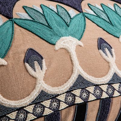 Bring the outdoors in with this lotus-patterned pillow, featuring textural touches of beading and embroidery, plus shimmering golden threads, trimmed with black and white twisted cording.