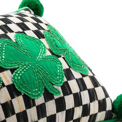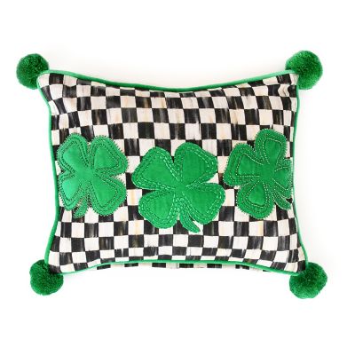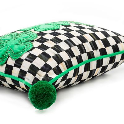 Our Lucky Clover Lumbar Pillow is as fresh as the first day of spring, with three beaded green velvet four-leaf clovers on a background of Courtly Check®, trimmed with green velvet piping and green pom-poms on the corners.