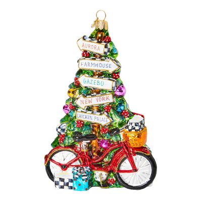Add to the memories year after year with our collection of beautiful glass ornaments that are mouth-blown and hand-painted in Eastern Europe by some of the world’s most talented glass artisans. This glass ornament features a MacKenzie-Childs bicycle and signage for all the landmarks on our Aurora Farm, including the Farmhouse and the Chicken Palace. It’s presented in a keepsake gift/storage box.