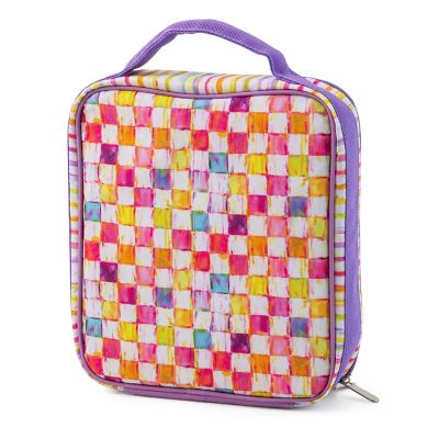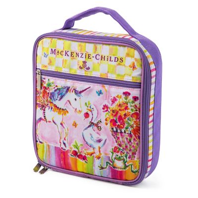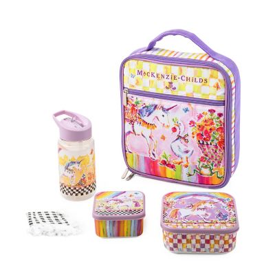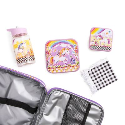 Make mealtime fun with our happy designs. This soft, insulated lunch box, decorated in a unicorn theme, holds two food-safe containers, a PBA-free water bottle, and a gingham napkin.