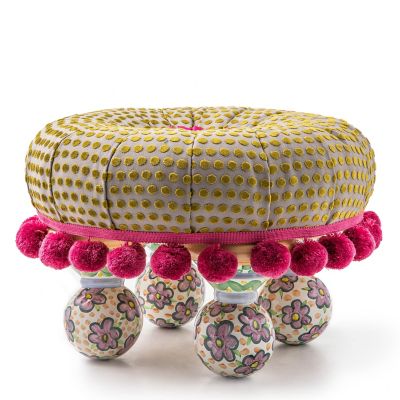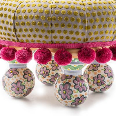 Created top to bottom by our artisans in Aurora, New York, this armchair accent is upholstered in woven dot fabric and embellished with exaggerated pink pom-pom trim. This playful footstool sits on four ceramic ball feet, hand-painted with our classic Myrtle pattern.