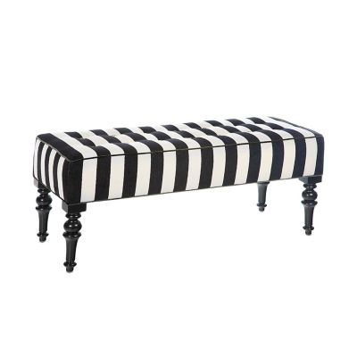 In the entry, in the study or in the dining room, you’ll be sitting pretty on the Chenille Black Stripe Marquee Bench. The seat is upholstered in striped chenille fabric that’s trimmed with custom black and white checked button tufting and black welt. Four turned wooden legs give it extra flair.