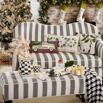 In the entry, the study or dining room, you’ll be sitting pretty on the Chenille Grey Stripe Marquee Bench. The seat is upholstered in striped chenille fabric that’s trimmed with custom black and white checked button tufting and contrasting natural white welting. Four turned wooden legs give it extra flair.
