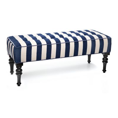 In the entry, in the study or in the dining room, you’ll be sitting pretty on the Chenille Navy Stripe Marquee Bench. The seat is upholstered in striped chenille fabric that’s trimmed with custom black and white checked button tufting and contrasting periwinkle cording. Four turned wooden legs give it extra flair.