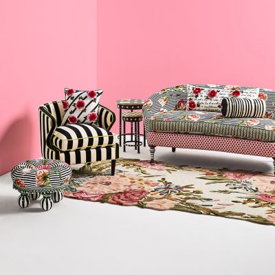 The Marquee Bolster Pillow is a versatile addition to our Spot On and Queen Bee furniture collections, featuring dimensional stripes done in embroidery and beads, trimmed on either end with black and white check piping and checked buttons.
