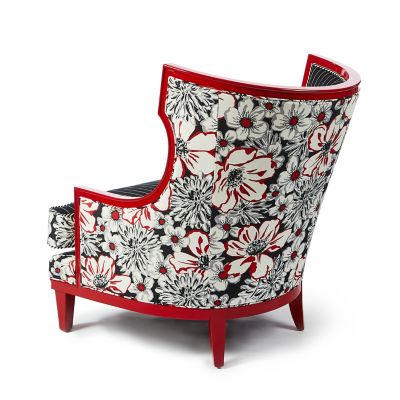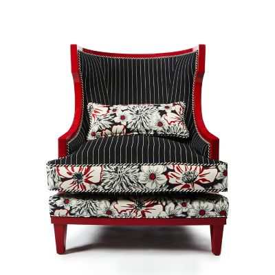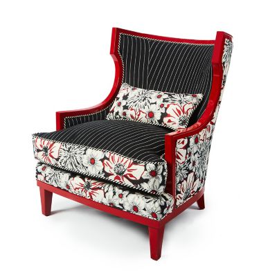 sheen crimson finish. It’s upholstered in a palette of patterns, including pinstripes on the