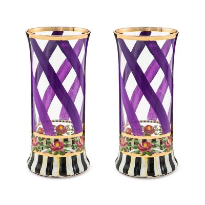 Make any occasion more special by setting the table with this set of two hand-painted, mouth-blown highball glasses. Featuring a pattern of lavender ribbon swirls and pink roses on a base of Courtly Stripe, they’re trimmed with gold lustre.