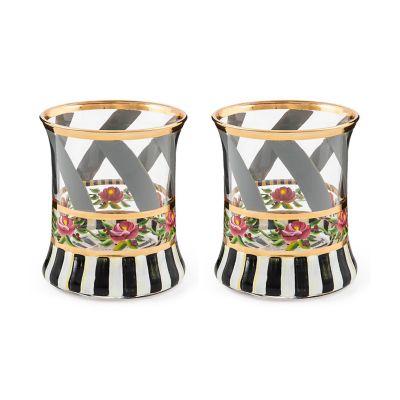 Make any occasion more special by setting the table with this hand-painted, mouth-blown tumbler glass. Featuring a pattern of grey ribbon swirls and pink roses on a base of Courtly Stripe, it’s trimmed with gold lustre.